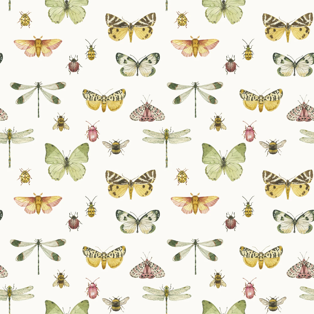 This charming fabric features a delightful array of fluttering butterflies, buzzing bees, and delicate dragonflies, all set against a soft, light background. The design captures the whimsical essence of a garden in spring, with each insect illustrated in soft, pastel hues of green, yellow, pink, and white, creating a serene and playful aesthetic perfect for a variety of crafting projects.