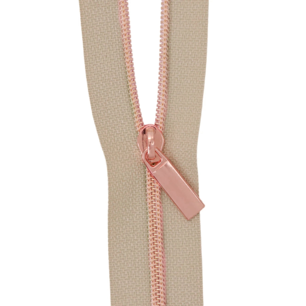 Includes 3 yards of #3 beige zipper tape with rose gold coil by Sallie Tomato and 9 matching bar pulls.