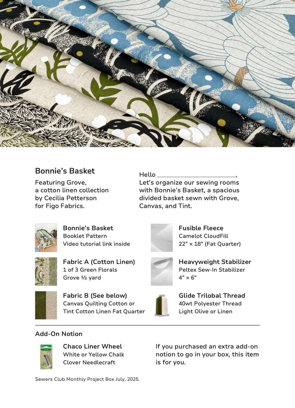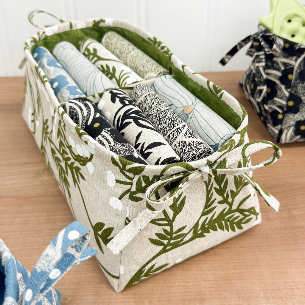 This Sewers Club Kit features the Bonnie's Basket pattern. It includes Grove by Cecilia Petterson and Space Dyes for Figo Fabrics. Kit makes one basket.