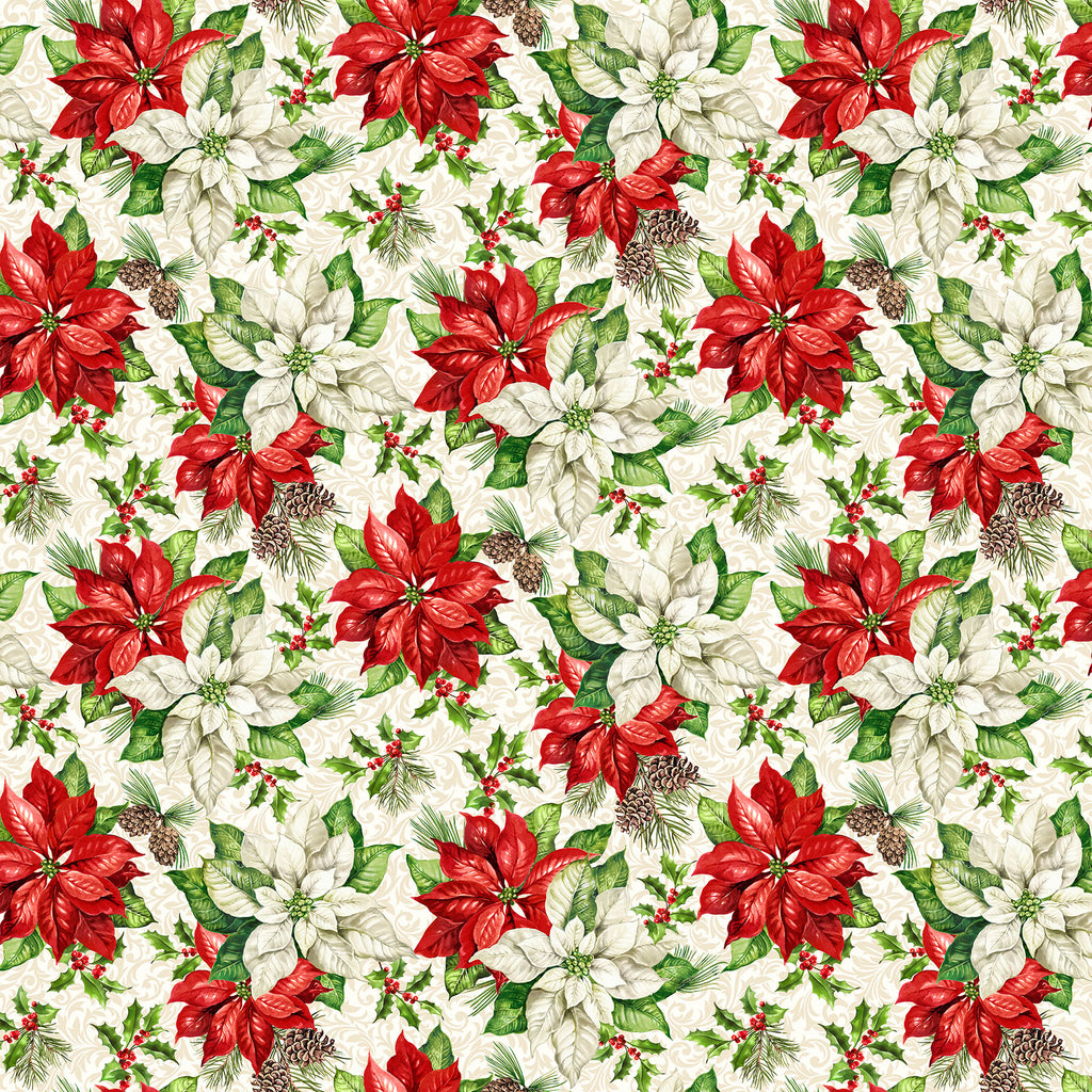 Holiday Joy features Christmas fabrics with poinsettias in red and white.