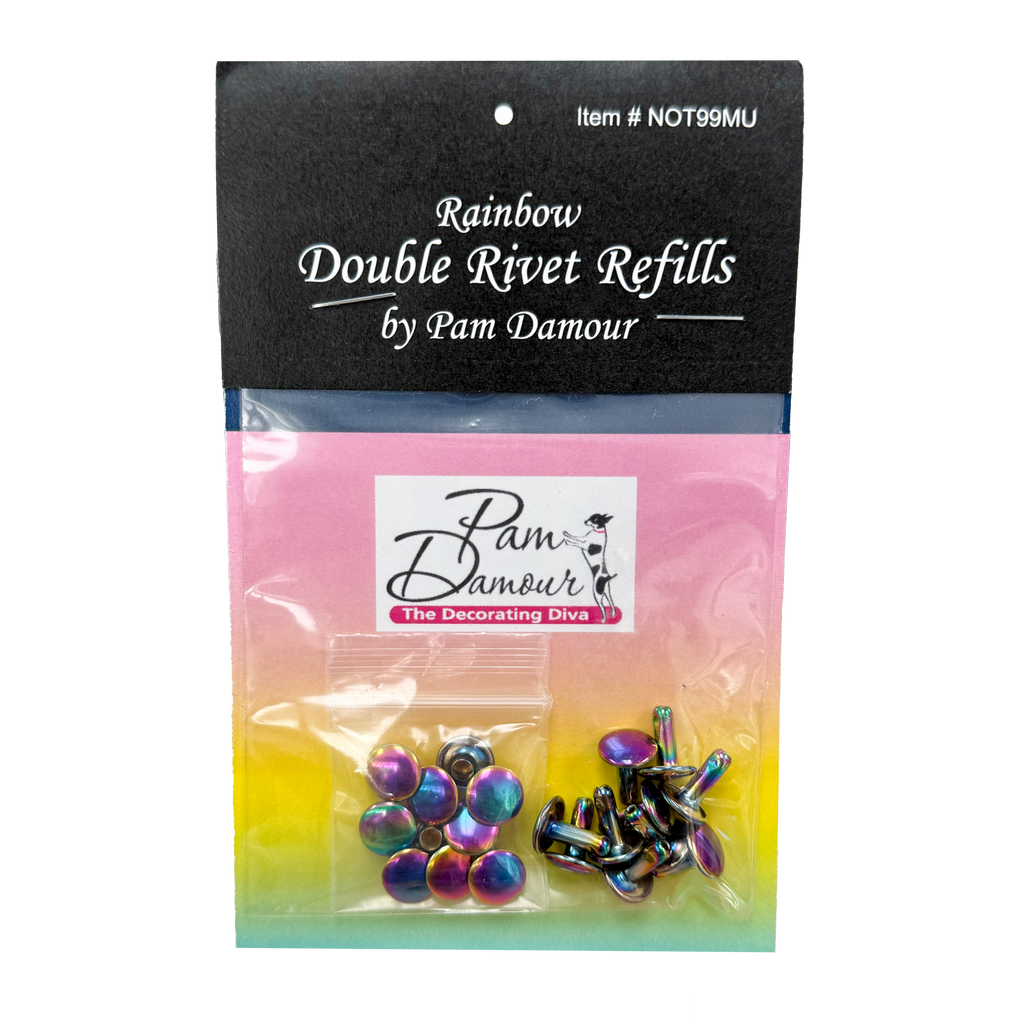 Package of 10, double cap rivets with a rainbow finish by Pam Damour.