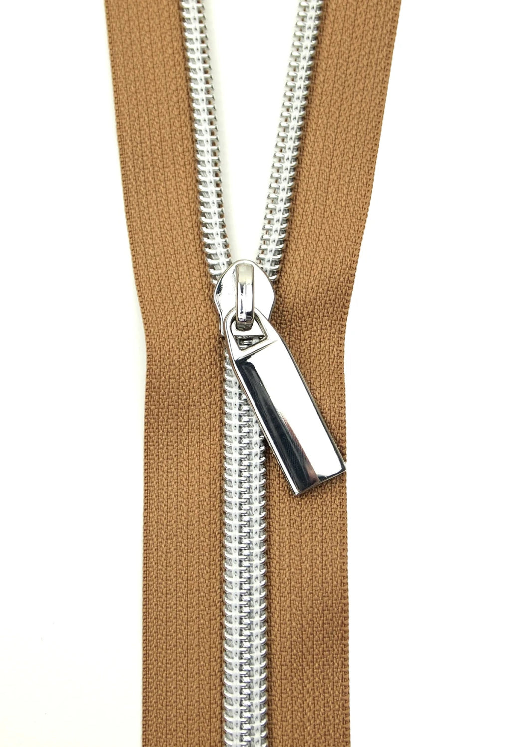 Includes 3 yards of #5 natural zipper tape with nickel coil by Sallie Tomato and 9 matching bar pulls.