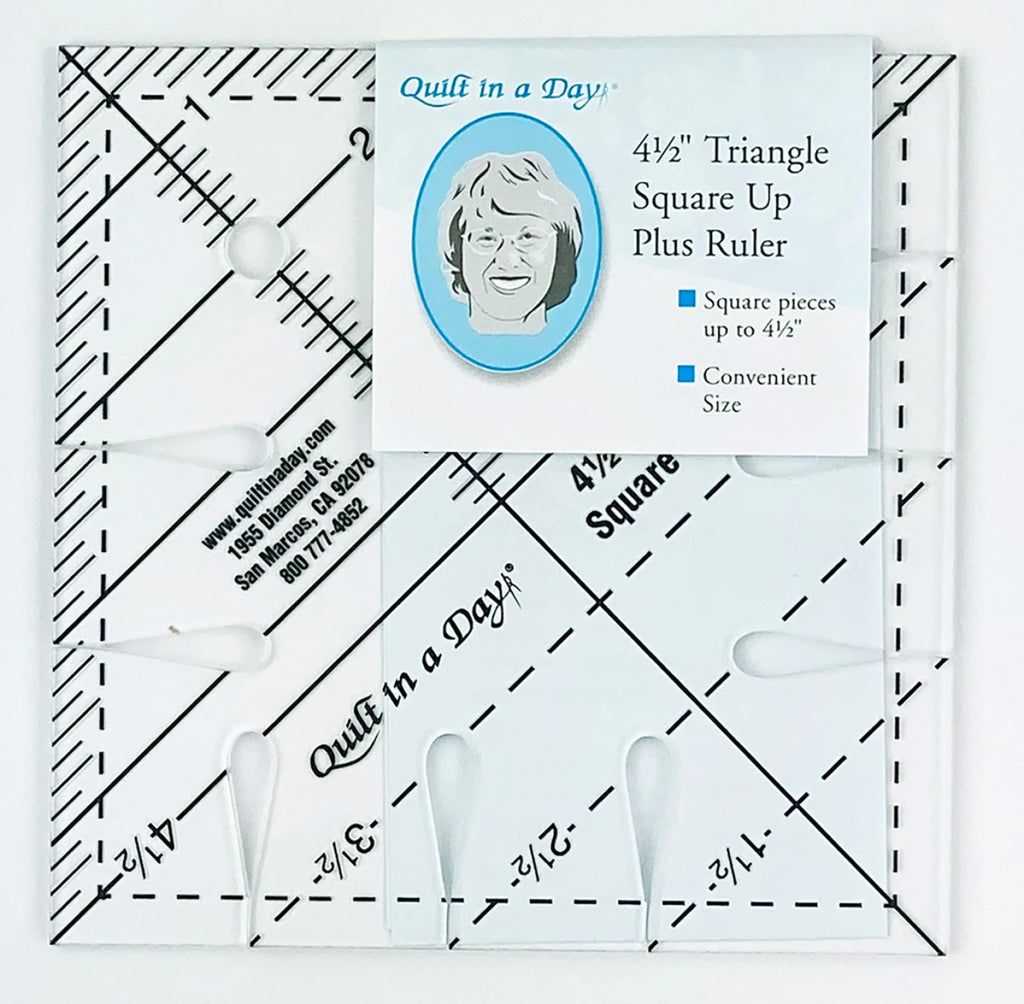 4 1/2 Triangle Square Up Plus by Quilt in a Day This New and improved Triangle Square Up Ruler makes perfect half triangle squares or quarter triangle squares in half the time. Features tip grooves to trim tips at 1" & 1/2" increments. Squares patches up to 4 1/2 inch. The ruler is marked in two colors for easy reading and coordinates with the most popular ruler brand. Convenient 1/8 inch, 1/4 inch, 1/2 inch and 1 inch lines for precise measuring. Laser cut and printed on Polyarbonate Clear Plastic. Fully illustrated and detailed instructions are included. Made in the USA.